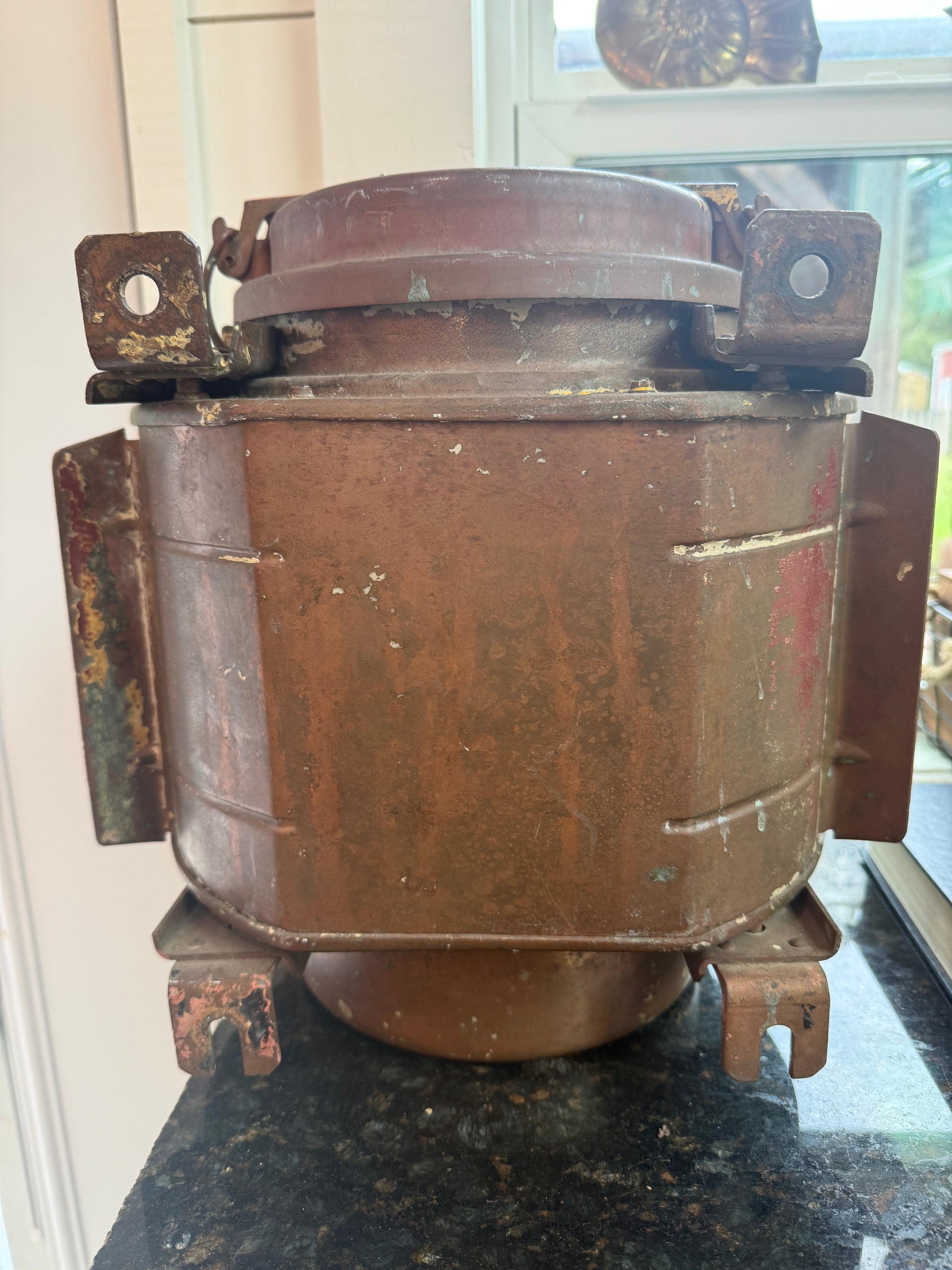 Very Vintage Ship Salvaged Brass and Copper Running Light. Wall mounting present. Industrial wiring replaced with residential plug and switch. Ship paint and patina present. Could shine up.